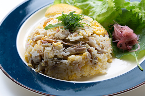 - ③卵の7割くらいに火が通ったら、ほぐした塩さば、冷ごはん、刻みハムを加えてよくかき混ぜながら炒める。